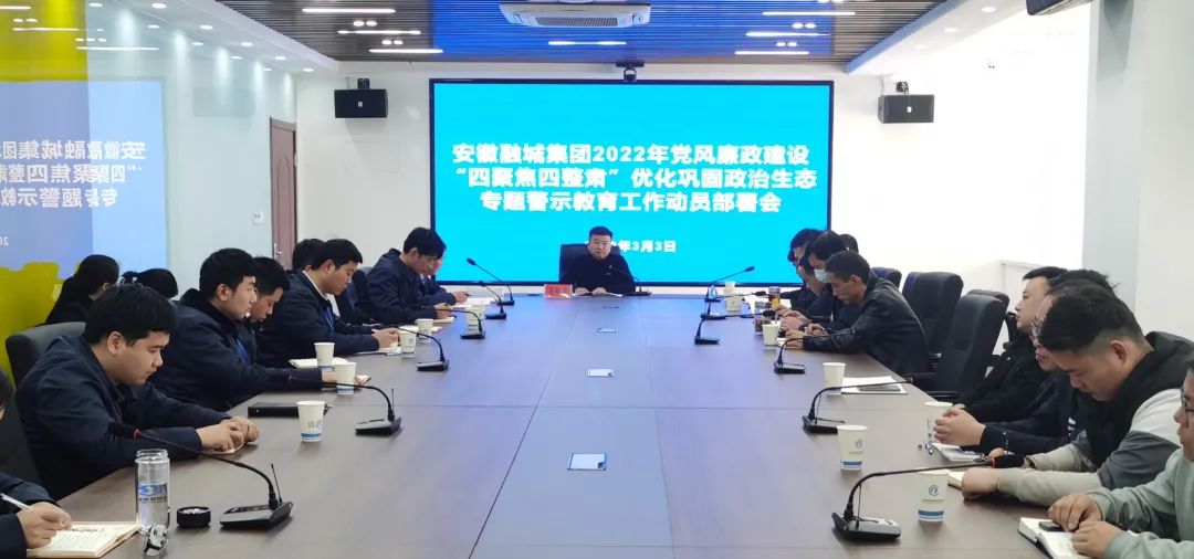 3月3日下午,融城集團(tuán)組織本部及子公司綠博公司、高科公司和商投公司(代管)全體人員,召開2022年黨風(fēng)廉政建設(shè)“四聚焦四整肅”優(yōu)化鞏固政治生態(tài)專題警示教育暨“嚴(yán)紀(jì)律·轉(zhuǎn)作風(fēng)·樹形象”紀(jì)律作風(fēng)專項(xiàng)整治工作動(dòng)員部署會(huì)。會(huì)議傳達(dá)學(xué)習(xí)了中央、省、阜陽市、界首市紀(jì)委全會(huì)會(huì)議精神和省、阜陽市改進(jìn)工作作風(fēng)為民辦實(shí)事為企優(yōu)環(huán)境大會(huì)會(huì)議精神,高新區(qū)黨工委“四聚焦四整肅”警示教育工作動(dòng)員會(huì)精神,部署了融城集團(tuán)“四聚焦四整肅”優(yōu)化鞏固政治生態(tài)專題警示教育暨“嚴(yán)紀(jì)律·轉(zhuǎn)作風(fēng)·樹形象”紀(jì)律作風(fēng)專項(xiàng)整治工作實(shí)施方案。